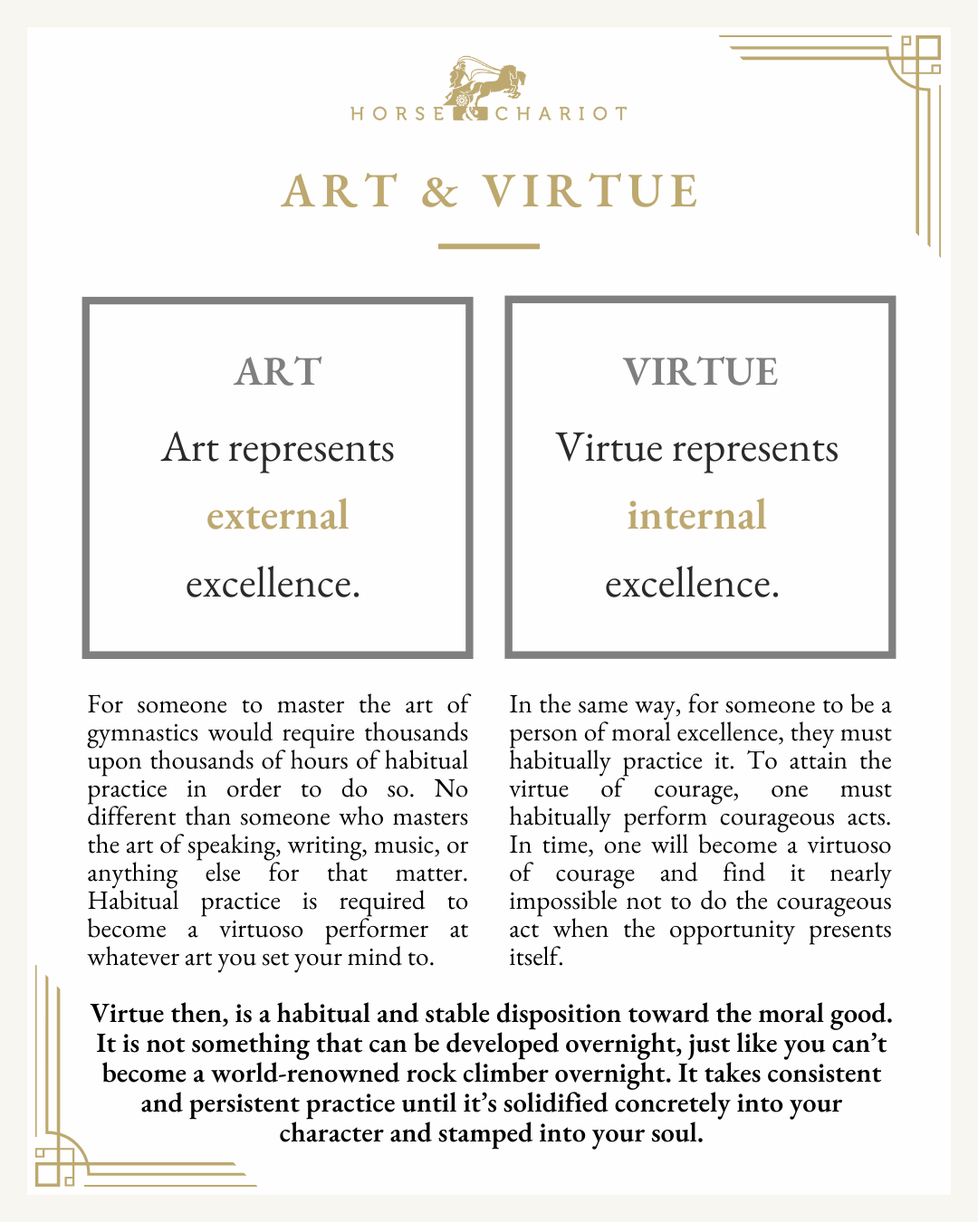 The same is true for the soul. The pursuit of moral excellence—virtue—requires just as much practice as any art. The difference is that, while art shapes the body and mind, virtue shapes the heart and soul. To become courageous, you must habitually perform courageous acts. To become patient, you must practice patience again and again, even when it pains you. To become honest, you must choose honesty, especially when it exposes you. Eventually, it becomes second nature—like muscle memory for your character—to the point where not doing what is courageous, patient, or honest when the opportunity presents itself is next to impossible.