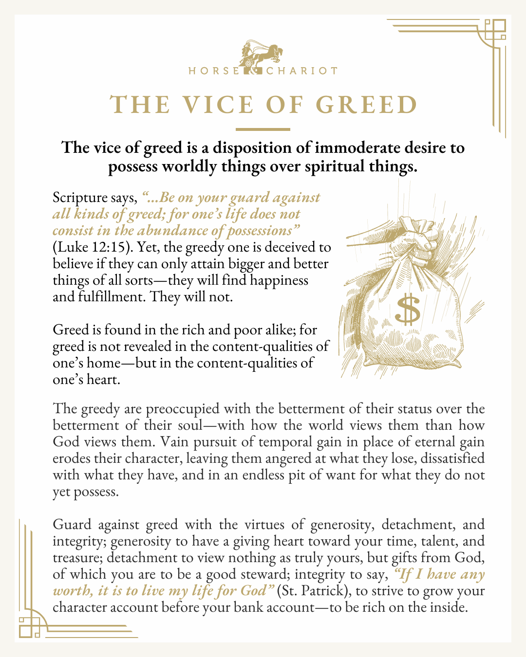 Greed makes you more concerned with how the world views you than with how God sees you. The vain pursuit of temporal gain over eternal gain erodes your character—leaving you angered at what you lose, dissatisfied with what you have, and trapped in an endless pit of want for what you do not yet possess. Greed places the betterment of your status above the betterment of your soul—and in the end, leaves you empty.