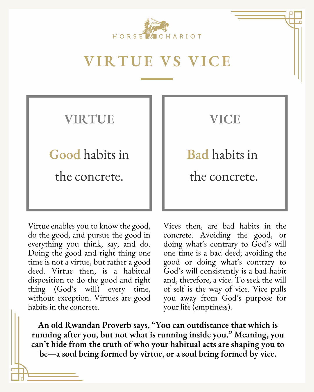 It’s been said, “You can outdistance that which is running after you, but not what is running inside you” (Rwandan Proverb). You can hide from others. You can disguise your actions. But you cannot outrun your own soul. Day by day, your habits are shaping you—either into the likeness of Christ or into something far from Him. You are becoming, right now, either a person of virtue or a person of vice.
